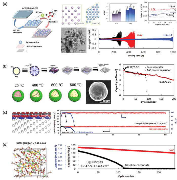 图1 基于(a)银-氟化锂人工界面,(b)富LixAl位点铝基宿主结构和(c)少层石墨烯-三维储锂结构的锂金属负极保护;(d)对锂稳定的新型腈类电解液