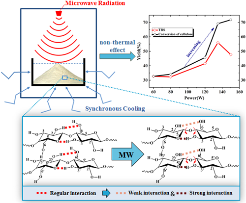 团队通过包含“去结晶”与“再水解”的“两步法”水解路线的构建,成功去除了由纤维素分子链超强自聚集本性引导形成的初始“顽固”结构,明显提升了纤维素的水解可及性,促进了糖产物产率及选择性的提升,尤其在微波驱动水解中取得了较好的水解效果(Bioresource Technol., 2013,137: 106-110)。在此基础上,通过水解体系与驱动方法的设计优化对纤维素水解可及性及响应速度进行调控。在富含极性非质子溶剂环丁砜的水解体系中,利用环丁砜与纤维素分子链上羟基间的吸附作用,成功实现了对再生纤维素因分子链自聚集产生的自发再次结晶的控制,抑制了结晶结构更加完善的I型结晶的产生,同时引导相对水解响应能力更高的II型结晶的形成,进一步提升了纤维素的水解可及性与效率(ACS Sustain. Chem. Eng., 2016, 4: 1507-1511)。在新型微波驱动方式方面,成功开发了带有同步冷却的微波驱动方法,在适宜恒定的反应温度下,有效强化了微波非热效应,由此对纤维素分子链间相互作用及再次结晶能力进行调控,促进水解成糖效率的进一步提高(Carbohydrate Polym., 2018, 197: 414-421),如图1。
