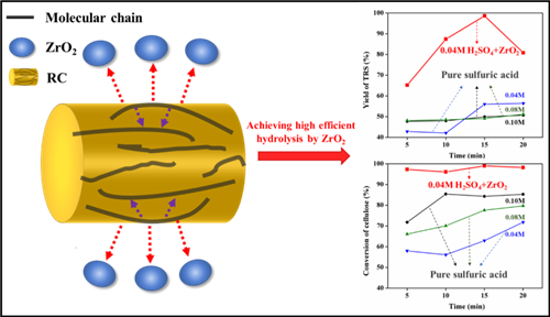 图2 运用含ZrO2的催化体系成功激发纤维素在水相、低酸、温和条件下的高效水解响应并成糖