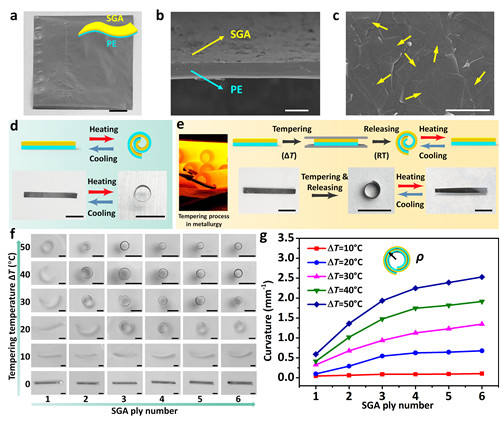 图1 a-c) SGA/PE双层复合膜形貌;(d) 常规热驱动变形;e) 限域回火处理变形;f-g) 限域回火形变调