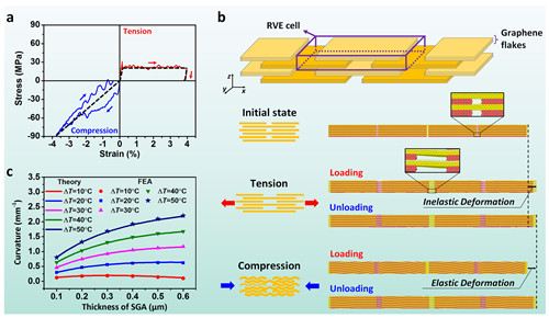 尤其重要的是,通过与香港理工大学姚海民教授团队在分子动力学模拟和有限元分析上的合作,表明SGA层具有非对称弹塑性力学性能,SGA受拉伸时由于内部各石墨烯片层之间不可逆的相对滑动而表现为高塑性,SGA受压缩时由于可逆的屈曲褶皱变形表现为高弹性。在受限空间下的回火处理过程中正是SGA层非对称弹塑性力学性能使得SGA/PE具有室温构型可编程性能,通过理论计算得到的回火处理的SGA/PE变形曲率和实际变形曲率具有良好的一致性(图2)。