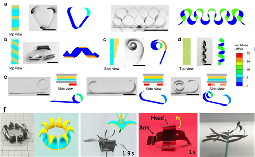 图3 通过不同策略 (a-d图案化SGA和PE层、e局域回火处理) 编程SGA/PE初始构型;f) 虹膜、百合、仰卧起坐机器人、含羞草