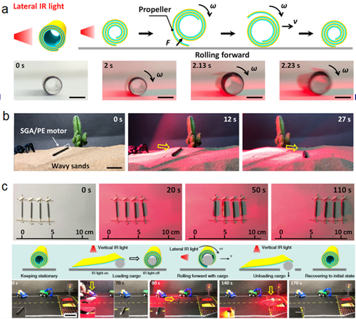 特别需要提及的是,限域回火处理后的SGA/PE双层膜在室温下自发卷曲成多层卷构型,可用于构筑不受束缚的光控运动器件,其在外界侧向红外光照刺激下可实现在平地与模拟沙漠上的连续翻滚前进运动(图4a-b,视频2),还可组装成四轴运动的摩托机器以及基于此的可运输物品的软体机器人(图4c,视频3和4)。