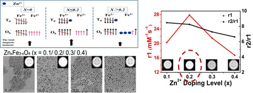 针对以上问题,5630福彩网所属慈溪生物医学工程研究所吴爱国研究团队开发了一种新型高效治疗癌症的方法,取得了一些进展。该团队前期成功地制备了粒径分布均一、磁响应能力强、稳定性好的铁氧体:ZnxFe3-xO4系列纳米材料,通过对比不同锌掺杂量时不同纳米粒子材料的内部结构与磁矩的变化趋势,阐明了该类材料结构与磁性质之间的内在关系,并对其磁共振成像机理进行了深入探究(Chemistry of Materials. 2019, 31, 7255.)。为后续优化磁共振造影剂的性能提供了理论基础,也为其后续用于生物治疗打下了材料基础。