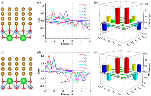 图1 (a)和(b)分别为TiO2-BTO/Fe和BaO-BTO/Fe结构图,黄色、绿色、蓝色和红色分别表示Fe、Ba、Ti和O原子;(c)和(d)分别为TiO2-和BaO-终端中Fe原子态密度;(e)和(f)分别为TiO2-和BaO-终端中Fe原子轨道分辨MAE