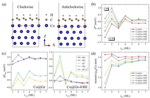 图2 (a) Co(4ML)/Gr-4/8H的CW和ACW示意图,箭头表示旋转方向;(b) 表示不同氢浓度DMI对Co层厚度的变化;(c) Co/graphene和Co/graphene-4/8H中与DMI相关的SOC能量随Co厚度的变化;(d) 不同氢浓度下Co原子的平均磁矩随厚度的变化