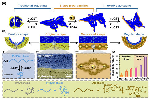 研究人员利用紫外光分步聚合的方法制备具有双层结构的水凝胶,首先通过光引发聚合构建具有形状记忆能力的海藻酸钠-聚丙烯酰胺(Alg-PAAm)水凝胶,随后在其顶部灌入N-异丙基丙烯酰胺(NIPAm)预聚液并再次光引发聚合,最终得到具有形状记忆与驱动功能的Alg-PAAm/PNIPAm双层水凝胶驱动器。