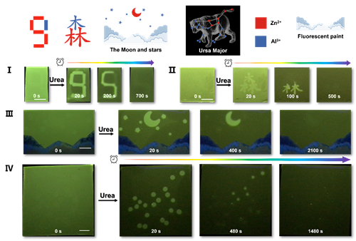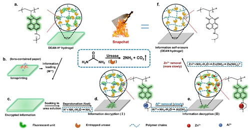 近期,陈涛研究员课题组和北京航空航天大学刘明杰教授课题组合作,报道了一种具有瞬态荧光性能的智能水凝胶并将其用于多级信息存储,实现了信息的加密-解密-自擦除。该工作通过在聚丙烯酰胺水凝胶网络中原位引入尿酶(urease),利用尿酶-尿素催化反应,原位实现萘酰亚胺荧光基团从质子化状态(DEAN-H+)向去质子化状态(DEAN)的转变,达到快速降低水凝胶荧光强度的效果。除了能发生质子化-去质子化反应过程外,萘酰亚胺荧光基团还能与不同金属离子(Zn2+、Al3+)配合,在维持水凝胶荧光强度的同时,降低荧光水凝胶荧光强度减弱的速率(在尿素溶液中)。基于此,金属离子Zn2+、Al3+可以通过离子印染技术引入水凝胶表面,以实现加密信息的输入。但由于不同金属离子与萘酰亚胺荧光基团的配位能力不同,在解密的过程中(尿素溶液处理),荧光减弱的速率不同,从而实现水凝胶表面荧光强度的时空调控,多级加密信息的解密-自擦除。