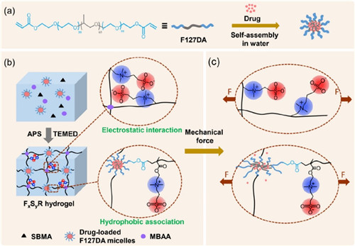 图1 (a,b)水凝胶制备过程示意图;(c)机械力作用下水凝胶网络的变形和药物释放示意图