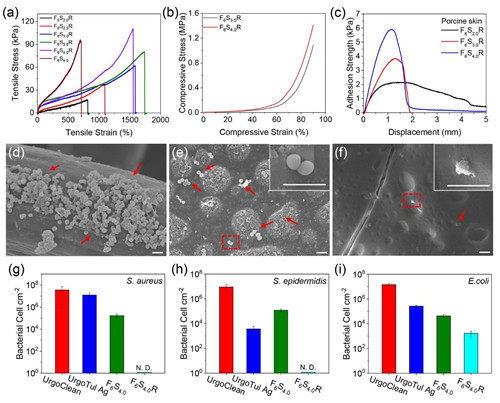 图2 水凝胶的(a)拉伸应力-应变曲线、(b)压缩应力-应变曲线,(c)水凝胶在猪皮表面的粘附强度-位移曲线;金黄色葡萄球菌在(d)UrgoClean敷料, (e)F6S4.0和(f)F6S4.0R水凝胶表面生物膜形成情况的SEM图;(h,g,i)不同细菌在敷料和水凝胶表面粘附的数量
