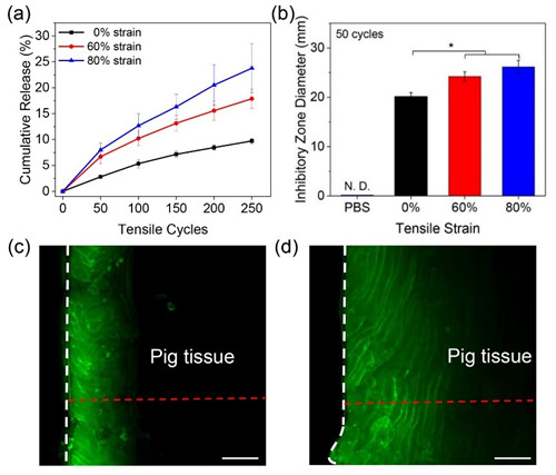 图3 (a)不同拉伸应变下F6S4.0R水凝胶的药物释放曲线及(b)其所释放药物溶液对金黄色葡萄球菌的抑菌圈大小;在荧光水凝胶(c)静置100分钟和(d)60%应变下压缩循环1000次之后猪肉组织截面的荧光共聚焦显微图像,标尺代表250μm,白色虚线右侧为猪肉组织,红色虚线代表荧光强度测量区域