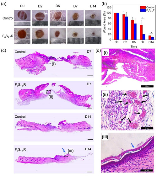 图4 (a)伤口修复过程代表性照片,(b)伤口大小,以及(c,d)水凝胶组和对照组伤口区域的H&E染色图像(蓝色箭头:上皮层;黑色箭头:在伤口区域形成血管)