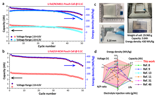 430Wh/kg锂金属二次电池及其电化学性能