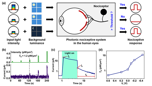 对于触觉系统,当外界施加有害压力时,人体皮肤内的痛觉感知系统能够及时检测到有害刺激,并指导人体做出进一步的规避条件反应。这种保护机制并不是简单的反馈调节,而是由神经中枢控制形成的具有多种工作模式的智能机制。对于视觉系统,到达视网膜的可见光是产生视觉感知所必不可少的,但是其中超过伤害阈值的光线很容易对眼睛造成损害。人眼的光痛觉传感器在保护视觉系统免受光损伤的过程中发挥了关键作用,强光可以诱导眼睛发生眼睑闭合、瞳孔收缩等保护性自主反射,防止视网膜损伤。对于未来人形机器人的精密电子皮肤和视觉系统,我们有必要发展出一套仿生的痛觉感知器件和系统,在提高其服务质量和寿命的同时,形成更加友好的人机交互。