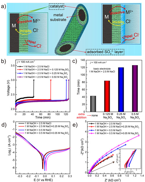 5630福彩网氢能材料与应用系统技术实验室所针对海水电解中阳极易受电解液腐蚀的关键科学问题,通过对电解液的调控,将海水电解制氢稳定性提升了5倍。研究发现在电解液中加入硫酸盐可以有效地延缓氯离子对阳极的腐蚀,提升海水电解制氢过程中阳极的稳定时长。研究人员以泡沫镍作为阳极,用不同盐浓度的电解液进行测试,观察到硫酸根的加入可以有效提高其耐腐蚀性,延长其在海水电解中的稳定时长。并通过对腐蚀电位、电流、电阻的分析,确认了硫酸根在防氯腐蚀方面的优势。在此基础上,理论模拟和原位红外、原位拉曼实验均证明,在反应电位下,硫酸根作为强酸阴离子可以优先吸附在阳极表面形成负电荷层,进而通过静电斥力排斥氯离子远离阳极表面,从而达到了延缓氯离子腐蚀阳极的效果。进一步,以常规催化剂电极-镍铁水滑石阵列(NiFe-LDH/NF)作为阳极进行海水电解制氢反应,发现硫酸根依然能大幅度提升其稳定性。最后,在添加硫酸根的电解质中,NiFe-LDH/NF阳极在模拟海水和真实海水中400 mA cm-2电流下的稳定时长分别长达1000小时和500小时,是未添加硫酸根的传统电解质中稳定时长的近6倍。