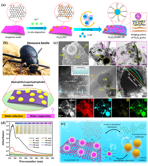 图2 (a)受沙漠甲虫背部启发的Fe3O4/GO@C-SR颗粒的制备示意图;(b)Stenocara甲虫背部具有集水和保水作用的亲水/超疏水微结构示意图;(c)Fe3O4/GO@C-SR颗粒的微观形貌;(d)添加量对Fe3O4/GO@C-SR颗粒乳液分离性能的影响;(e)Fe3O4/GO@C-SR颗粒对水包原油乳液的分离机理