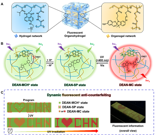前期,智能高分子团队与北京航空航天大学刘明杰教授课题组展开合作,报道了一种具有瞬态荧光性能的智能水凝胶并将其用于多级信息存储,实现了信息的加密-解密-自擦除(Angew. Chem. Int. Ed., 2021, 60, 3640)。最近,双方再次合作,通过两步互穿法构筑了油/水异质网络,其中水凝胶网络含有萘酰亚胺荧光基元(DEAN),油凝胶网络含有光响应性的螺吡喃荧光单元(SP)。通过紫外光的照射,使得SP的结构向部花青(MC)结构发生转变,进而触发两个荧光单元之间的荧光共振能量转移(FRET)效应,实现油水凝胶的荧光颜色从绿色到黄色再到红色的转变。若通过H+的处理,MC的结构会变成MCH+的结构,有效阻断FRET效应。利用这点,研究人员通过H+差异化处理油水凝胶、不同模块的组装,构筑了具有动态荧光信息防伪能力的信息存储装置。