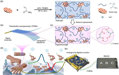 便携、柔性的人机交互器件在物联网、智能机器人等领域具有重要的作用,用户能够通过它们完成与系统的信息交换,或向系统发送指令。受生命体通过离子定向迁移传递生理电信号的启发,离子导电水凝胶材料被广泛应用于设计制作柔性可拉伸电子器件。然而水凝胶中的水在低温环境下会结冰,导致材料变脆,离子电导率下降,制约了其适用温度范围。如何设计耐低温柔性导电凝胶,并在此基础上制作具有广泛应用前景的智能人机交互器件仍是一个挑战。