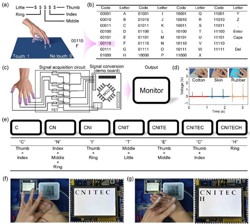 该工作通过溶剂置换的方法设计了一种由聚丙烯酰胺/纳米粘土交联网络和乙二醇/水二元溶剂为分散介质组成的有机凝胶(图1)。纳米粘土在作为物理吸附交联点的同时还提供了可移动的自由离子,使其具有离子导电性。乙二醇的引入赋予了该有机凝胶良好的抗冻性能,包括-0 ℃下良好的可拉伸性(700%)、离子电导率(1.5×10-3 S m-1)、透明度(91%)以及自修复性。进一步以有机凝胶为电极与弹性体组装制备了摩擦纳米发电机(TENG),得益于有机凝胶良好的抗冻性能,该有机凝胶TENG在-30 ℃仍保留了良好的发电性能。将其进一步附着在手指上开发了一种可穿戴的人机交互键盘。TENG在与其他物体接触分离的过程中能够产生相应的电压信号,这些电压信号被收集、编码,最终能够将对应文字信息显示在显示器上(图2)。本工作为凝胶材料在人机交互领域的应用提供了新的思路。