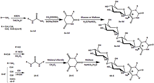 科研人员提出了一种合成糖基化巴比妥酸衍生物的新方法,无须借助保护-脱保护过程,可对糖环进行疏水段修饰(图2)。首先,合成了具有不同碳链长度的单取代(2a-2d)和双取代巴比妥酸(2B-E),进而通过与糖环之间的Knoevenagel缩合反应,合成了单尾葡萄糖基巴比妥酸盐(3a-3d)、单尾麦芽糖基巴比妥酸盐(4a-4d)和双尾葡萄糖基巴比妥酸盐(4B-E)。所得两亲性糖基化衍生物在水溶液中发生超分子自组装。结果显示,3a-d在加热条件下也不溶于水,4a-d在室温条件下均溶于水。科研人员还发现,降低水溶液的pH或者加入钙离子,能够诱导单尾麦芽糖巴比妥酸盐(4c,4d)自组装形成纤维状水凝胶(图3),其驱动力来自于巴比妥酸盐质子化,或者钙离子与巴比妥酸之间的配位作用。为了探究在强酸条件下的凝胶化过程,以4c为例,通过不同pH下的紫外吸收光谱发现,巴比妥酸存在烯醇式和酮式的相互转变,在强酸条件下,以酮式结构为主,导致凝胶化,并计算出PKa等于4.78。为了进一步探究凝胶化机制,科研人员用乙基取代巴比妥酸的仲氨氢原子,合成了4A进行对照,结果发现4A不能凝胶化,这表明仲氨基团作为一个优良的氢的供体,在自组装过程中起到关键作用。4B-E的测试结果显示,4C和4D在纯水中自组装形成囊泡水凝胶(图3)。从纤维到囊泡的转变依赖于不同的分子模型,单尾衍生物可形成蠕虫状纤维,双尾衍生物则趋于形成囊泡。同时也表明,仲氨基团在自组装过程中固然重要,但是增大分子的疏水性也能达到凝胶化目的。