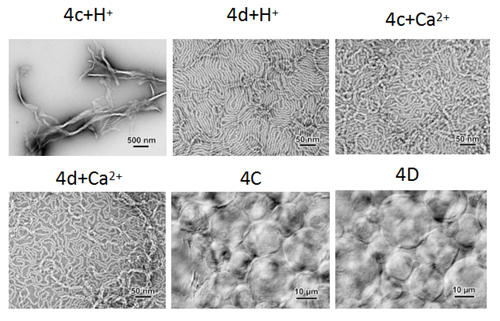 图3 在酸性和钙离子条件下4c、4d与在纯水条件下4C、4D的电镜图