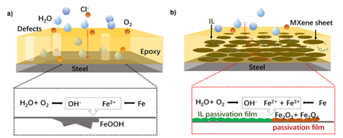 图1 WEP(a)和IL@MXene-WEP(b)涂层的防护机制