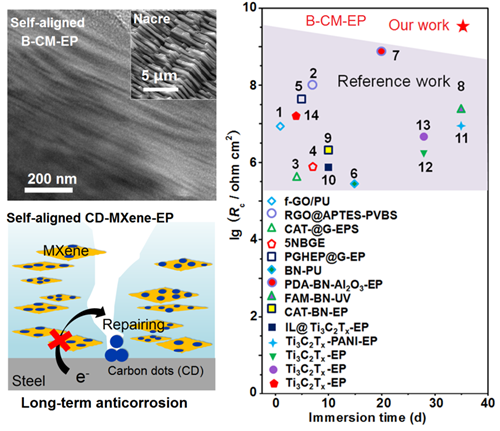 最近,该团队进一步利用碳点(CD),通过Ti-O-C功能化键合Ti3C2Tx纳米片以获得CD-Ti3C2Tx杂化物,显着提高了Ti3C2Tx在环境中的化学稳定性和灵活性。随后引入流动诱导组装策略来构筑MXene基三元仿生纳米复合涂层,其中CD-Ti3C2Tx自对准形成定向层状“仿贝壳”结构。其独特的结构赋予WEP涂层优异的疏水性和抗渗性,在~25μm的超薄厚度下阻抗模量提高4个数量级,比具有相同填料含量的随机分散复合涂层高2个数量级。CD还能够提供额外的“钝化”作用,以有效抑制局部损伤和裂纹传播。高度平行对齐的CD-Ti3C2Tx片层可以通过消除MXene/MXene和MXene/金属在垂直方向上的连接来抑制涂层的“腐蚀促进”行为,进一步提高涂层的稳定性和耐久性,实现长效防腐(图2)。此外,该策略有望实现MXene基复合涂层的力学强度和韧性的提升,同时兼具导电、导热、裂纹预警等功能特性,极大地扩展其在海洋和空间等高精尖设备防护领域的研究应用。