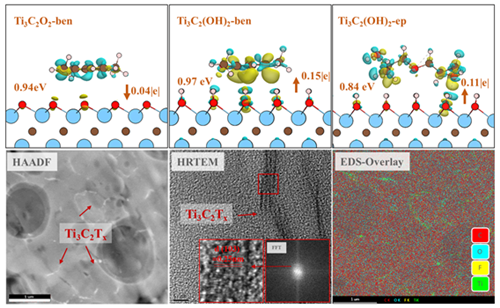 Ti3C2Tx表面通常覆盖F、O、OH等活性基团,但它们与环氧树脂分子之间的作用机制仍不清楚。团队针对这一问题进行了理论计算和实验研究。理论研究表明,Ti3C2Tx表面的F、O基团呈现亲核性,OH基团表现出亲电性,F、O和OH基团均对双酚A分子表现出了稳定的吸附性,其中OH基团表现出最优的吸附稳定性(图3)。电子结构结果表明,OH基团与苯环结构的π电子及环氧基团的孤对电子形成了共价成分化学键。进一步通过液相混合法制备了Ti3C2Tx-WEP纳米复合涂层,Ti3C2Tx在涂层中表现出良好的分散性和稳定性,并且显著改善了涂层中微孔的数量和尺寸。Ti3C2Tx物理阻隔作用和涂层致密性的提高赋予了复合涂层优异的防腐性能,其阻抗模量相比于纯环氧树脂涂层高出了2个数量级。该研究为Ti3C2Tx与环氧树脂基体间相互作用的进一步调控提供了可靠的研究基础。
