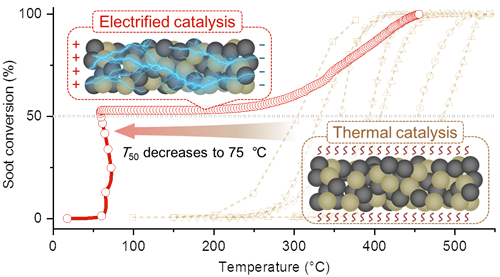催化燃烧是有效降解碳基污染物的普遍方法,研究人员在活性位设计合成与反应机理研究上持续取得重要进展。传统催化燃烧方法虽然可以将碳烟起燃温度降至排气温度范围内(~300℃)以实现其被动消除,但是车辆处于频繁怠速状态下排气温度低于200℃,现有技术极难突破这一温度限制。