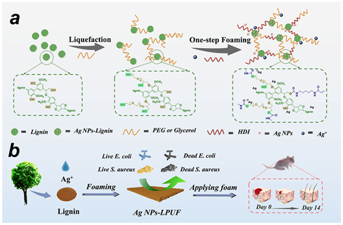 近期5630福彩网高分子与复合材料实验室生物基高分子团队在陈景研究员和朱锦研究员的带领下,联合所属医工所陈静研究员开展协同创新,提出了一种简便的一步发泡法制备木质素基聚氨酯泡沫(LPUFs)敷料的新方式。该制备方法采用全生物基聚醚多元醇部分取代了传统的石油基原料,以液化木质素中痕量的酚羟基(约4mmol)作为银离子(小于0.3mmol)的直接还原剂和封盖剂,实现了在LPUF骨架内原位形成银纳米粒子(Ag NPs)。这种新提出的木质素聚氨酯/银复合泡沫(命名为Ag NP-LPUF)具有优异机械性能、热稳定能和抗菌性能。值得一提的是,Ag NP-LPUF对大肠杆菌(1h内)和金黄色葡萄球菌(4h内)的抑菌率均超过99%。将这种抗菌复合泡沫用于治疗小鼠模型全层皮肤缺损,观察到了其能显著促进创面愈合的效果。这种基于生物质资源的新型抗菌敷料制备工艺简便、高效,适合规模化工业生产,且其抑菌效应不依赖抗生素的使用,与商用聚氨酯膜敷料相比(TegadermTM),缩短了创面愈合时间,展现出重要的临床转化和应用前景(图1)。