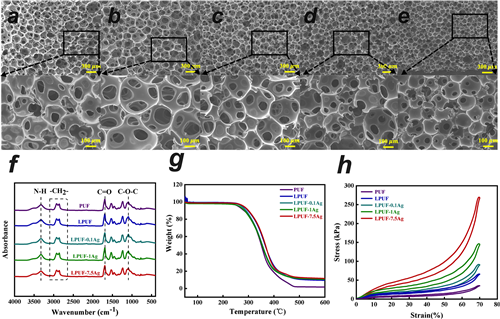 通过与聚氨酯泡沫(PUF)的对比发现,孔隙在泡沫体中呈均匀分布,具有相互贯通的开放孔形态,有利于血液和组织渗出物的快速吸收,促进伤口愈合。此外,液化木质素多元醇与聚氨酯(PU)基体具有良好的界面相容性。对于Ag NP-LPUF样品,随着原料硝酸银溶液浓度的增加,其孔径略有减小。一方面,Ag NPs在发泡过程中可以作为额外的成核位点,导致气泡尺寸减小,因此,复合材料中纳米填料数量的增加可能会导致材料的孔径减小。另一方面,在聚氨酯泡沫的制备过程中,水(作为发泡剂)的用量对多孔形态也有重要影响(图2)。