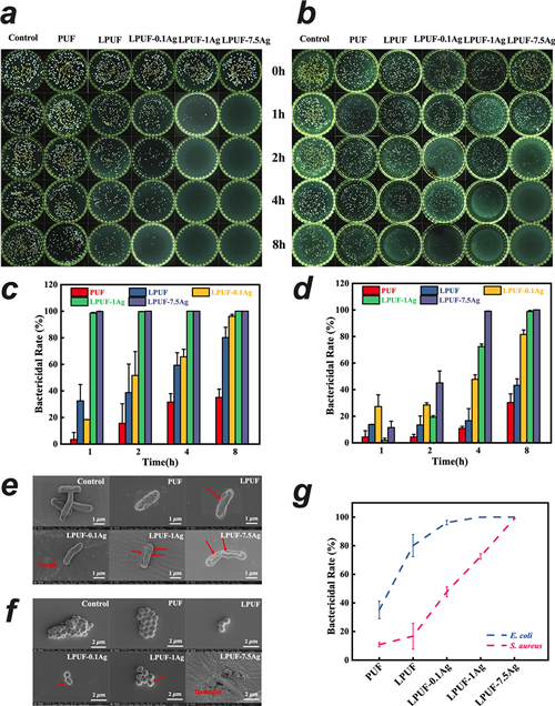 图3 PUFs的抗菌性能。分别在1h、2h、4h和8h对(a、c)大肠杆菌和(b、d)金黄色葡萄球菌的照片和相对菌活性