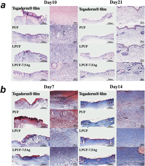 对不同时间的皮肤组织标本进行组织学分析,如图4所示,各组再生区均出现不同程度的肉芽组织。在第10天,PUF组几乎覆盖了一层完整的表皮,而Tegaderm膜组仍有较大的未闭合伤口。在第21天,泡沫敷料组观察到了血管和毛囊生成,尤其是LPUF-7.5Ag组,愈合过程加快,创面再生组织与正常组织相似。与之相比,Tegaderm膜组则没有观察到血管和毛囊生成。
