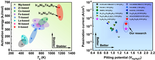 图1 左图为Ir-Ni-Ta-(B)非晶态合金与其他合金体系的晶化活化能对比图;右图为不同材料在硫酸溶液中的点蚀电位和钝化电流对比图