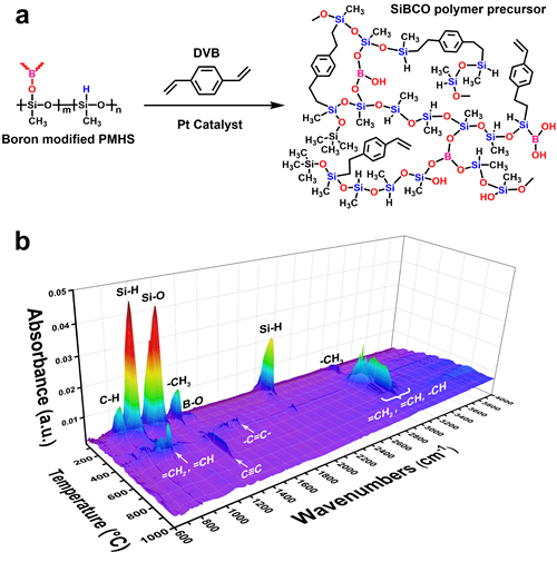 图1 (a)聚硅硼碳氧先驱体的交联过程和(b)在惰性气氛下热解过程中所产生的气体的FT-IR堆积图