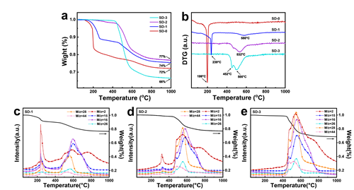 图2 (a)聚硅硼碳氧先驱体的TG和(b)DTG曲线;(c-e)硅硼碳氧聚合物先驱体在惰性气氛下热解过程中所产生的气体的TG/MS分析