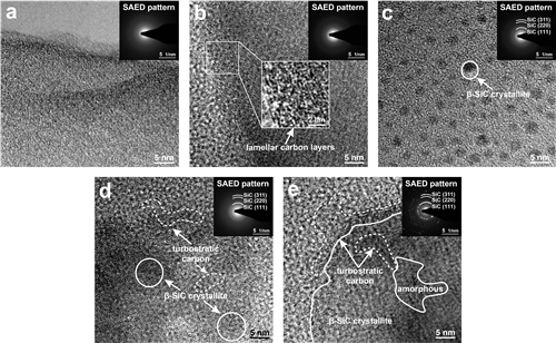 图3 (a-e)不同热解温度下硅硼碳氧陶瓷材料的HRTEM图像,插图是相应的SAED图案