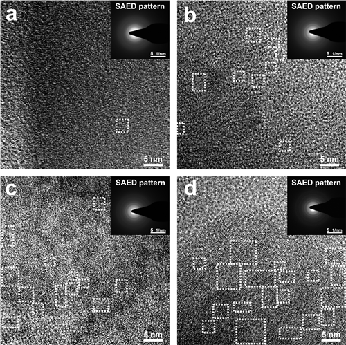 图4 (a-d)不同碳含量的硅硼碳氧陶瓷材料的HRTEM图像,白色方块突出显示了涡轮碳,插图是相应的SAED图案