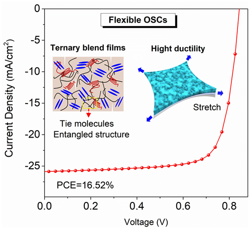 三元柔性OSCs的J-V曲线和活性层薄膜拉伸断裂机制示意图