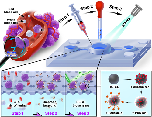 进一步,为了高效提取外周血样中的肿瘤细胞,提高SERS纳米生物探针对肿瘤细胞的靶向检测能力。纳米生物材料团队联合宁波诺丁汉大学任勇副教授团队,合作开发了微流控富集分离与拉曼光谱快速检测肿瘤细胞技术,开发出一种新型的基于微筛分离手段和肿瘤靶向特性的黑色氧化钛(B-TiO2)SERS生物探针用于循环肿瘤细胞(CTC)原位检测。该研究先利用微筛芯片对人体血液中目标细胞进行纯化分离,以排除大部分血液细胞的干扰,再利用叶酸修饰的SERS生物探针识别芯片上捕获的肿瘤细胞,从而实现外周血样中单个肿瘤细胞筛选和原位检测,实验结果具有高检测灵敏度、特异性和准确性。更重要的是,该研究工作设计的微流控-SERS生物探针能够有效应用于临床肿瘤样本的有效检测,有望为循环肿瘤细胞的检测提供新的策略(图2)。相关成果以“TiO2-based Surface-Enhanced Raman Scattering bio-probe for efficient circulating tumor cell detection on microfilter“为题发表在Biosensors and Bioelectronics,2022,210:114305(https://doi.org/10.1016/j.bios.2022.114305)。