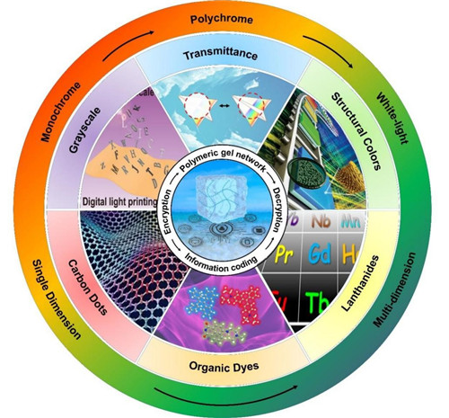 信息安全与人民生活、社会稳定甚至国家安全都息息相关,在过去的几十年里,为应对日益强大的伪造技术,各种防伪材料及相关的防伪技术已经得到了快速发展。然而,基于传统干态或硬质材料存储的信息往往以静态形式显示,易被破解,因此,亟需开发新型的信息防伪材料及相应的加密-解密策略来提高信息的安全等级。智能高分子凝胶具有可设计、修饰的三维网络结构,通过功能的赋予,这类材料在软机器人、组织工程、仿生皮肤等各个领域都具有巨大的应用前景和研究价值。特别当暴露在光、热、电、磁、机械力或化学物质等特定外部刺激下,智能高分子凝胶表现出的颜色或形状变化,使得这类材料有望在信息防伪领域取得应用。