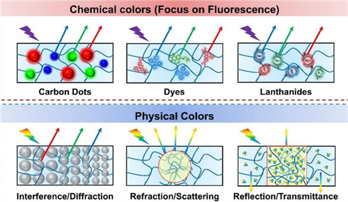 构建基于高分子凝胶基信息存储设备的关键是如何实现智能凝胶可调节的光学特性(如图2)。材料的光学性能主要表现在其对光的吸收、反射和透射等能力,即透明度、颜色、发光等方面的差异。根据设计方法,基于高分子凝胶的信息存储设备可根据不同的光学形式大致分为两大类:基于化学色的信息存储和基于物理色的信息存储。化学色(以荧光为主)通常通过物理掺杂或化学接枝的方法将碳点、有机染料以及镧系元素引入聚合物凝胶中得以实现,而物理色主要是由凝胶与光之间的相互作用产生(干涉/衍射、折射/散射、反射/透过)。在一定外界刺激条件下,相应的光学性质发生变化,即可对信息进行加密和解密。