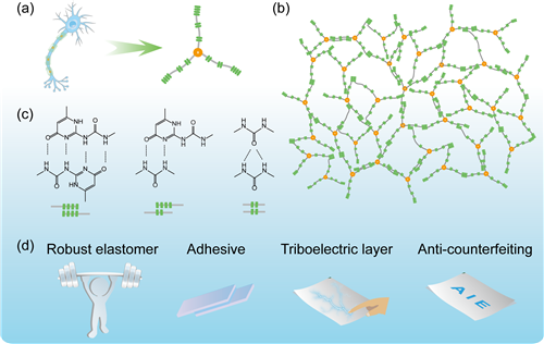 5630福彩网海洋新材料与应用技术重点实验室纳米复合工程材料团队陈海明副研究员、茅东升研究员等人,受神经元轴突结构的启发,合成了一种三臂结构的遥爪型纳米结构聚合物。该聚合物可以同时满足优异力学、快速自修复、摩擦起电和显示荧光的特性。通过在该遥爪型纳米材料的每条臂中嵌入大量脲基,构建了多级氢键网络,来模拟神经元网络;通过缩短每条臂长度,减弱分子链缠结,从而极大提高了自修复速率。研究表明,仅需调整体系氢键密度和分子臂长度,即可轻松实现纳米结构材料宏观多种性能的调控。最终,该纳米聚合物展现出优异的弹性模量(97.9MPa)、强度(22.5MPa)、断裂伸长率(1470%)、韧性(159.3MJ/m3),以及良好的抗缺口性能(187kJ/m2)和快速自修复能力(92%,0.5h)。同时,大量的氢键赋予材料良好的粘接能力,与铁板的搭接剪切强度可达20.7MPa。在去离子水、盐水、有机溶剂等多种环境中均表现出优异的环境稳定性,在水下封装和水下黏附领域具有重大的潜在应用前景。据了解,这是目前所报道热熔胶粘结强度的最高值。