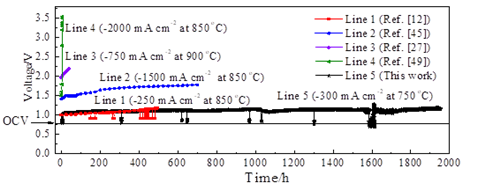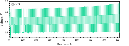 2020年,燃料电池技术团队通过电池性能的改善,进一步研究了平管型结构SOEC电解CO2的长期运行稳定性及其效率。结果显示,平管型结构SOEC在750 ℃与75 vol.%CO2-25 vol.%H2气氛中,以300mA/cm2恒定电流密度电解CO2运行接近2000h(文献报道的最长运行时间),衰减率为4.9%/kh。在电解CO2进程中,CO2转化率≥42%,CO生成速率≥180 mL/min,且该过程中的电解综合能量转化效率≥95%(Applied Energy, 259, 1141301, 2020)。