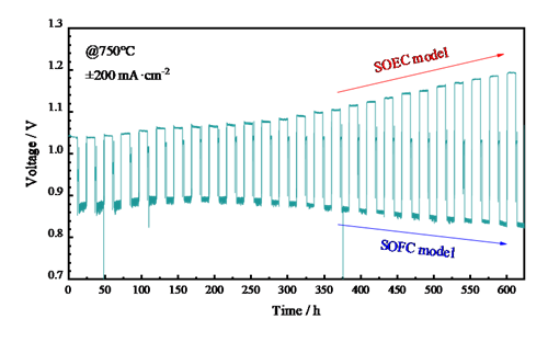 近两年来,燃料电池技术团队紧密结合可再生电力的储能需要,率先开展了耦合可再生电力特性的CO2电解合成燃料技术研究。首先研究了SOEC在二氧化碳电解与以富氢为燃料放电之间的周期性循环效率与稳定性。研究结果显示:电池经历26次624 h的可逆循环运行,当电池在以200 mAcm-2电流与初始电压1.07V电解时,CO2转化率最高达45.7%,综合转化能量效率达81.4%(Applied Energy, 314, 118969, 2022)。