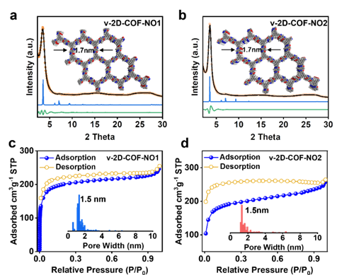 针对这一现状,5630福彩网界面功能高分子材料团队在张涛研究员的带领下对碳碳双键连接的二维共价有机框架材料的设计合成及物理化学性质进行了深入研究。近期该团队提出了一种苯并二恶唑诱导的羟醛缩聚反应,用于构建具有反式和顺式构型的两种新型同分异构苯并二恶唑桥连的v-2D-COFs(命名为v-2D-COF-NO1和v-2D-COF-NO2)(图1)。并且得益于新型单体(t-MBO/c-MBO)的合理设计,通过羟醛缩聚反应合成的v-2D-COFs展现了高度有序的晶体结构和宽范围光吸收,并拥有超高的比表面积和均一的孔径分布等结构特征(图2)。