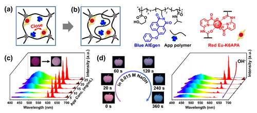 智能荧光高分子水凝胶是一类发光性能可调的高分子软材料,其三维交联网络中包含大量水分子的独特结构特点,使其可兼具经典荧光材料和高分子水凝胶的共同性能优势及两种材料集成后可能衍生出的新性能,在传感检测、信息防伪、仿生驱动、软体机器人等应用领域得到广泛关注,是先进发光高分子材料领域的重要发展方向之一。目前,智能荧光高分子水凝胶多是通过两种或多种荧光团的物理共混或无规共聚合等方法来制备,存在变色范围窄、功能单一等问题。