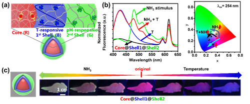 针对高分子水凝胶荧光变色范围窄的难题,团队借鉴变色龙的皮下组织中不同色素细胞基元结构及其有序排列的多级层状结构,建立仿生多层结构设计的材料构筑新方法,首先通过半互穿网络结构设计,将红、蓝两种荧光团分别化学共聚入不同高分子网络中(图1),增大两种荧光团间距离,因而可利用氢氧化钠刺激实现红色荧光团发光强度的连续改变而不显著影响蓝色荧光团发光强度,从而实现水凝胶荧光颜色在蓝、红二色间的宽范围连续调控。进一步构筑仿生核壳结构高分子水凝胶(图2),使三原色荧光团空间分布在不同核或壳层中,大大增加各荧光团间距离,因而可利用外界刺激实现各荧光团发光强度的连续改变,从而显著拓宽高分子水凝胶的荧光变色范围至全光谱。