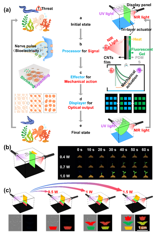 反观自然界,变色龙、章鱼等生物体可根据环境需要呈现多彩皮肤颜色变化,生物学研究表明,优异变色性能主要来源于其皮下组织中不同色素细胞基元结构及其有序排列的多级层状结构。此外,变色龙还可利用皮肤变色和身体变形等的多功能协同来执行伪装、交流等复杂任务。这些生物体变色现象及其多功能协同行为可为智能多色及多功能荧光高分子水凝胶的构筑提供诸多借鉴。