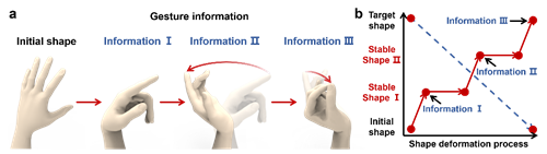在日常交流的过程中,手语作为一种独特的无声语言可以利用手势变化连续地传递出不同信息,并且对于经过特殊编码的手势,未经专业训练的人无法解读其手语背后的信息。因此,这种基于形态变化的形态信息对于信息的加密、传递以及解密具有独特的优势(图1)。尽管智能形变材料可实现程序化变形,但其一次编程往往只能展现一种形态,因此试图通过形变材料来模仿手语从而进行大容量、可连续的形态信息传递依然是一个巨大的挑战。
